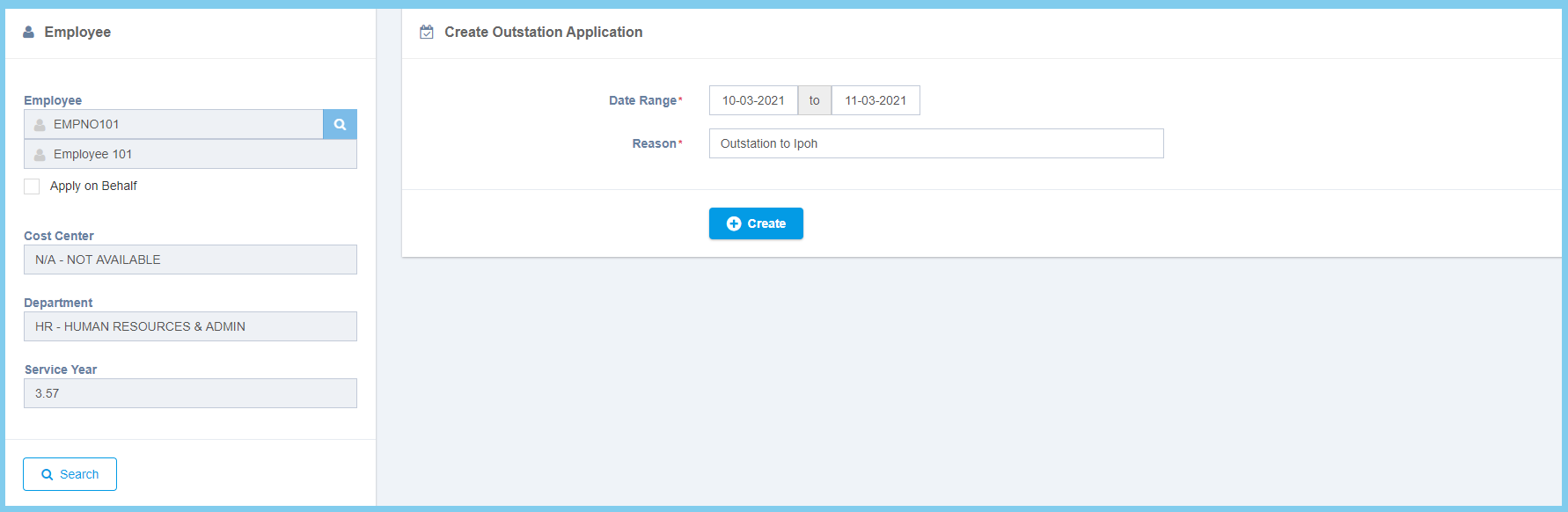| Reason | Any alphanumeric | Enter any reason for why to apply outstation. |
