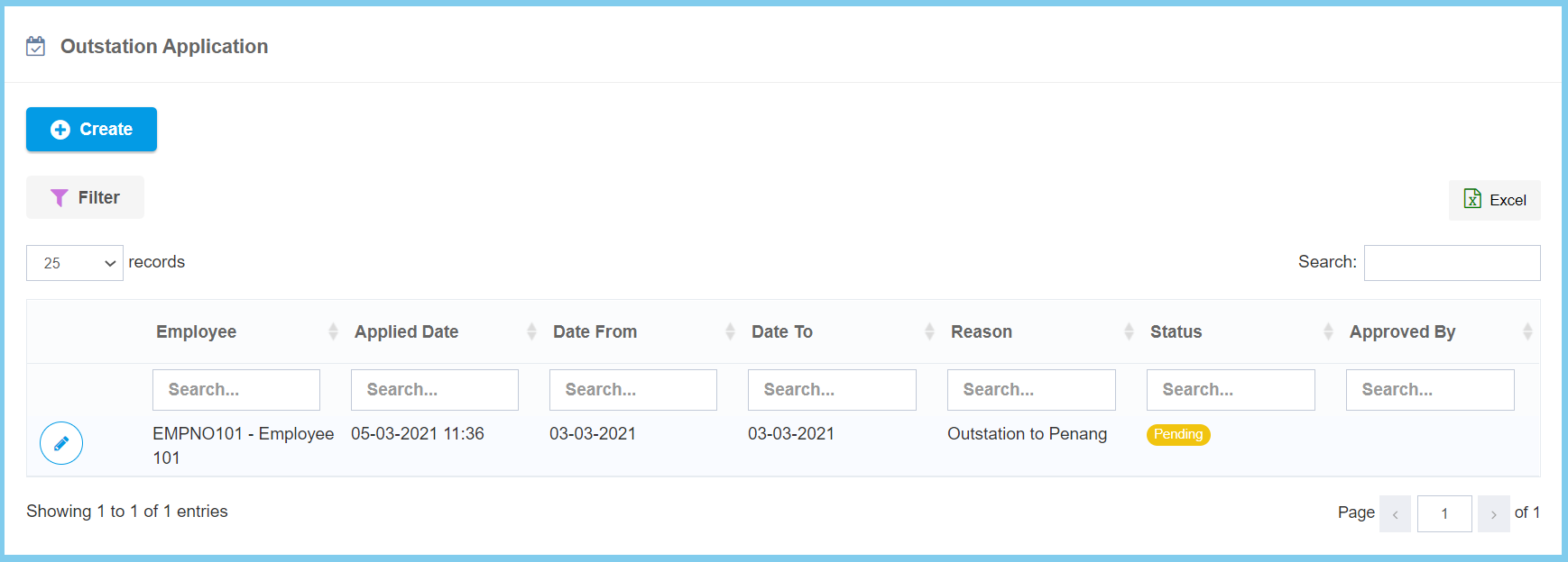 Note: You can click Filter button to select the date range of outstation that you wish to view.