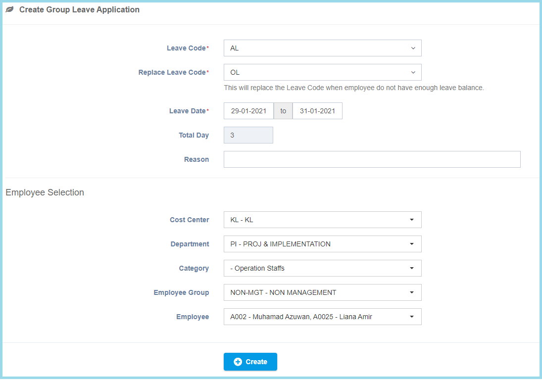 | Leave Code | Selection from leave code | To select any leave code which want to apply by this group employee.