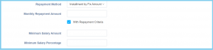 Minimum Salary Amount Any number Enter the minimum salary amount that only can apply advance salary. This configuration will show when the selection of repayment method is Installment by Month and Installment by Fix Amount.