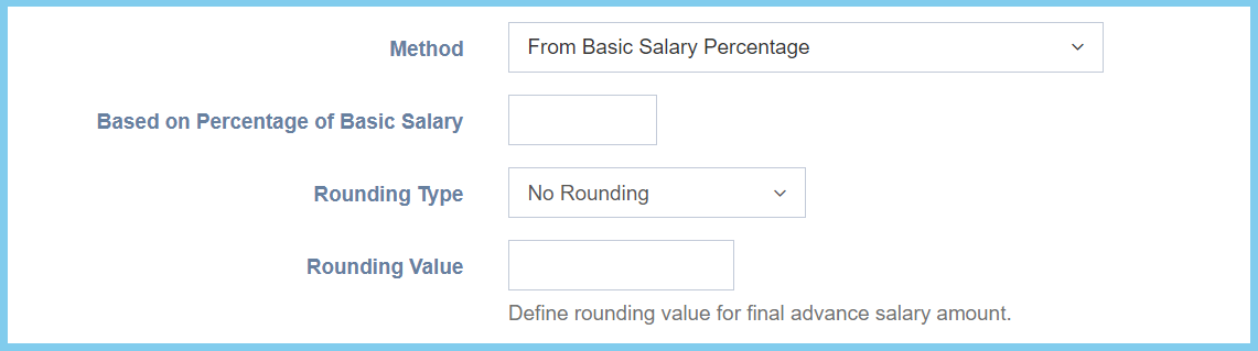 Select the rounding type of advance salary from option available. This configuration will show when the selection of method is From Basic Salary Percentage.