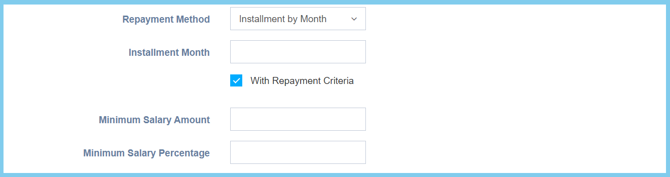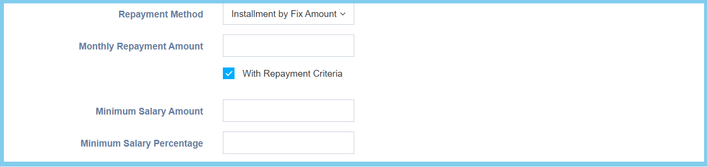 Minimum Salary Amount Any number Enter the minimum salary amount that only can apply advance salary. This configuration will show when the selection of repayment method is Installment by Month and Installment by Fix Amount.