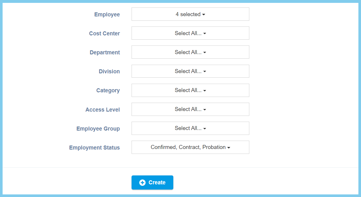 | Employement Status | Selection from employement status | Select the employement status of employee from option available. Can select more than one employment status that you wish. |