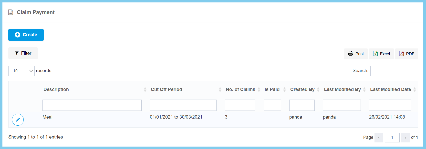 | Cut Off Period | Select date from calendar | Select the start date and end date of cut off period for this claim payment. |