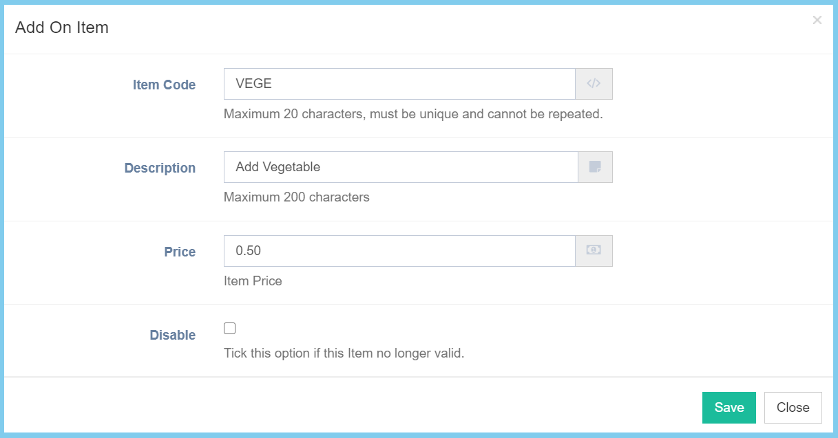 Item Code Any alphanumeric Enter an unique code for the item.