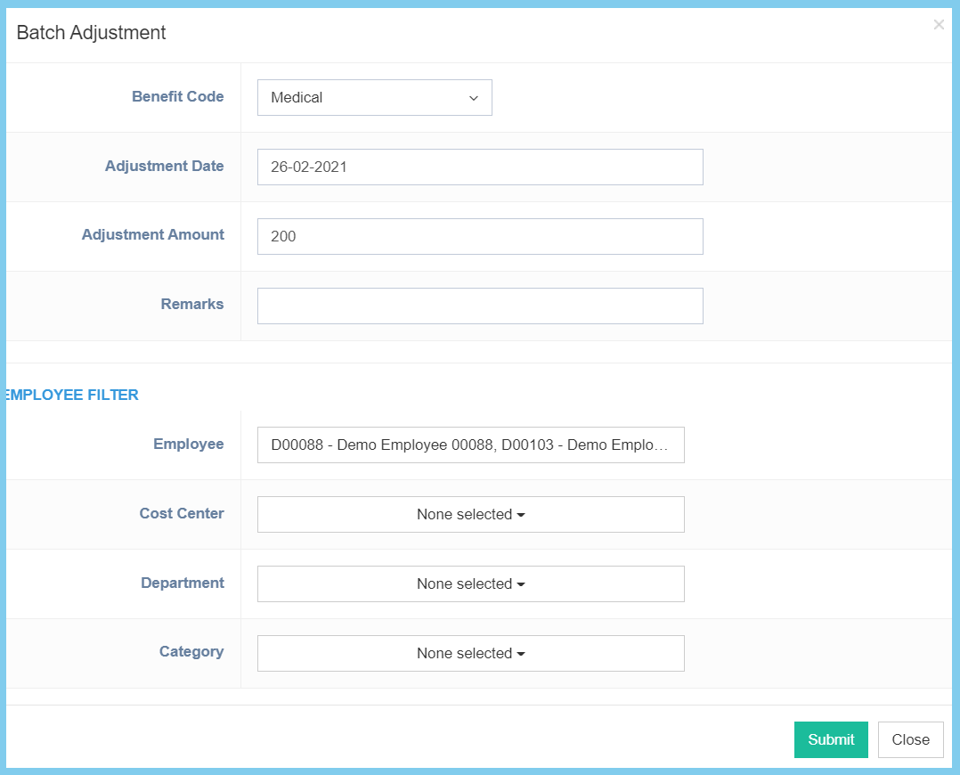 Note: The employee filter is use to select the employee who are involved in this benefit adjustment.