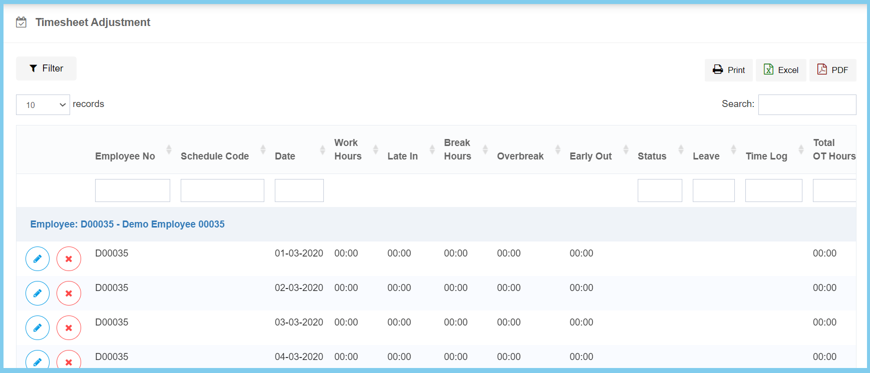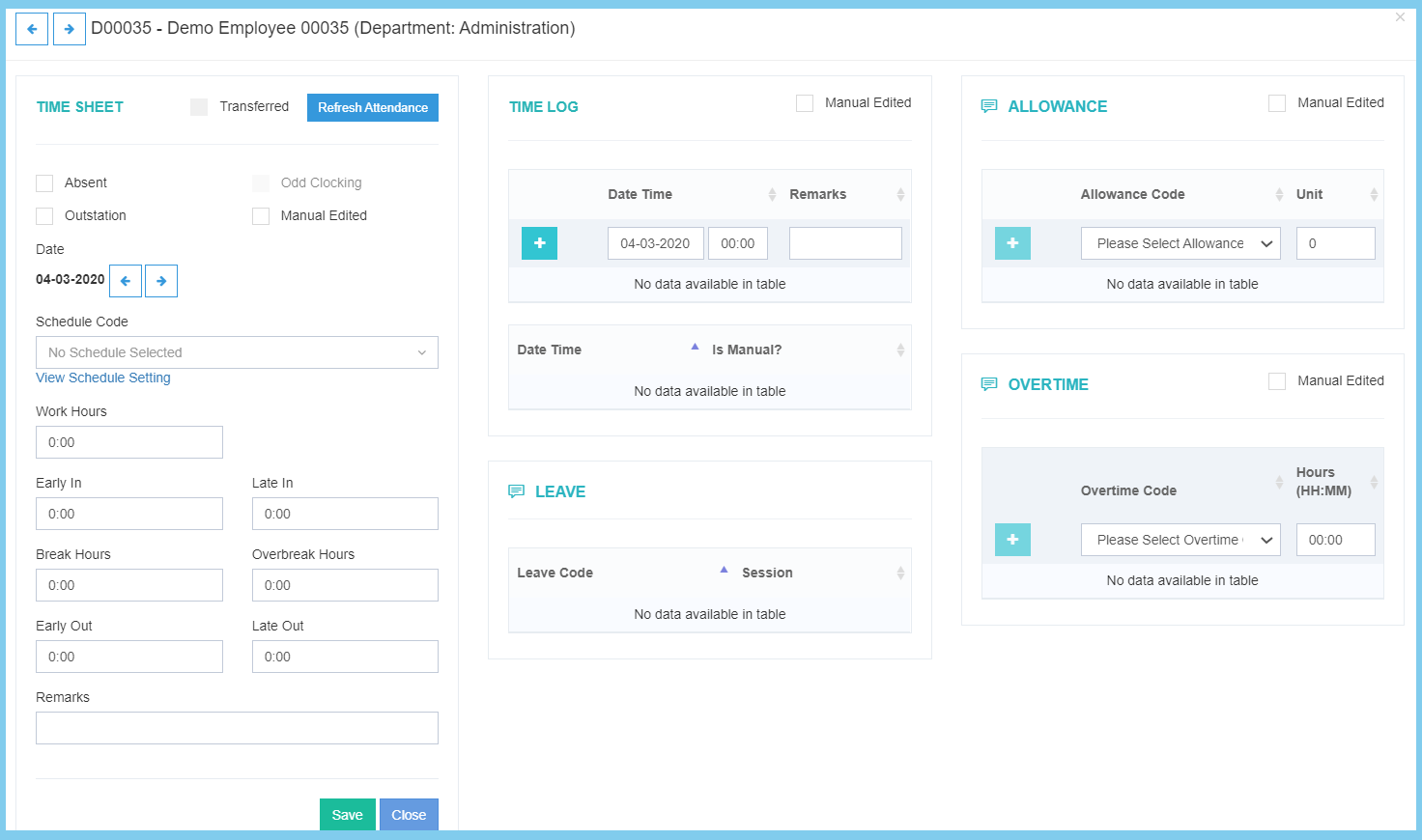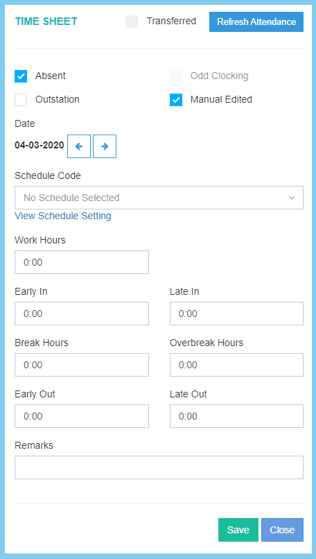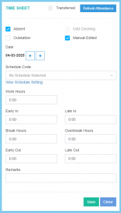 | Break Hours | Time Format HH:MM | It will automatic show at first, if got any mistaken, it enabled to edit the employee total breaks hours. |
