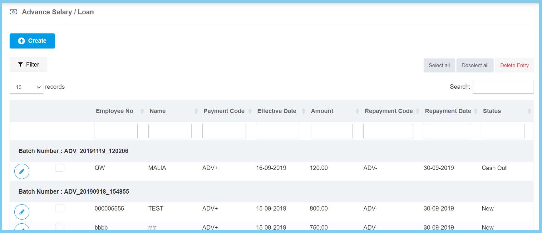 Select the payroll type of advance salary from option available. |