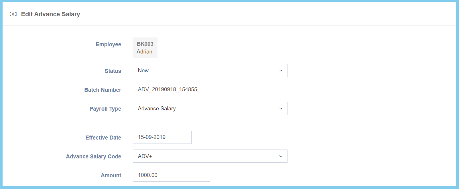 | Amount | Any number | Enter the amount of advance salary. |