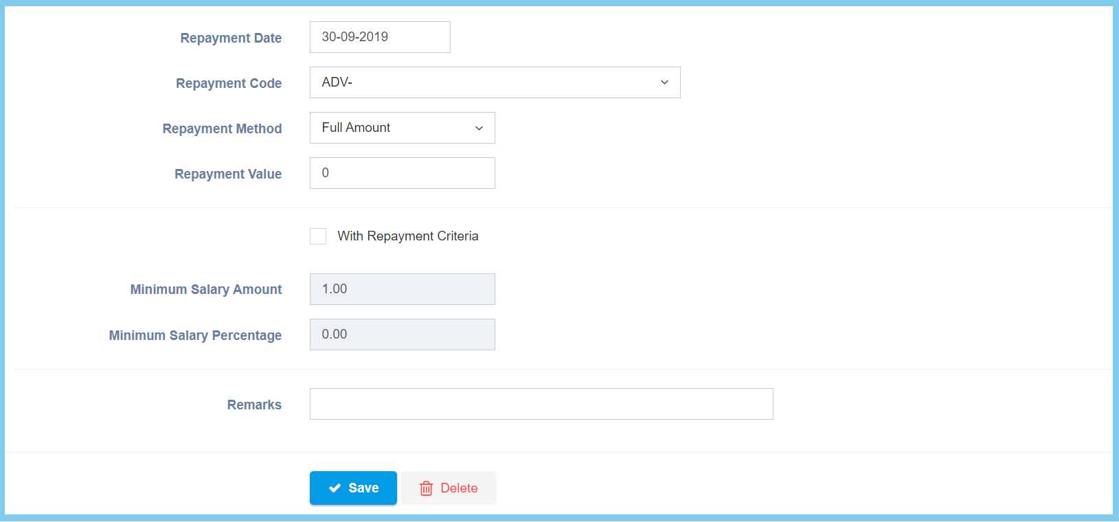 | Repayment Date | Select date from calendar | Select the repayment date of advance salary from calendar available. |