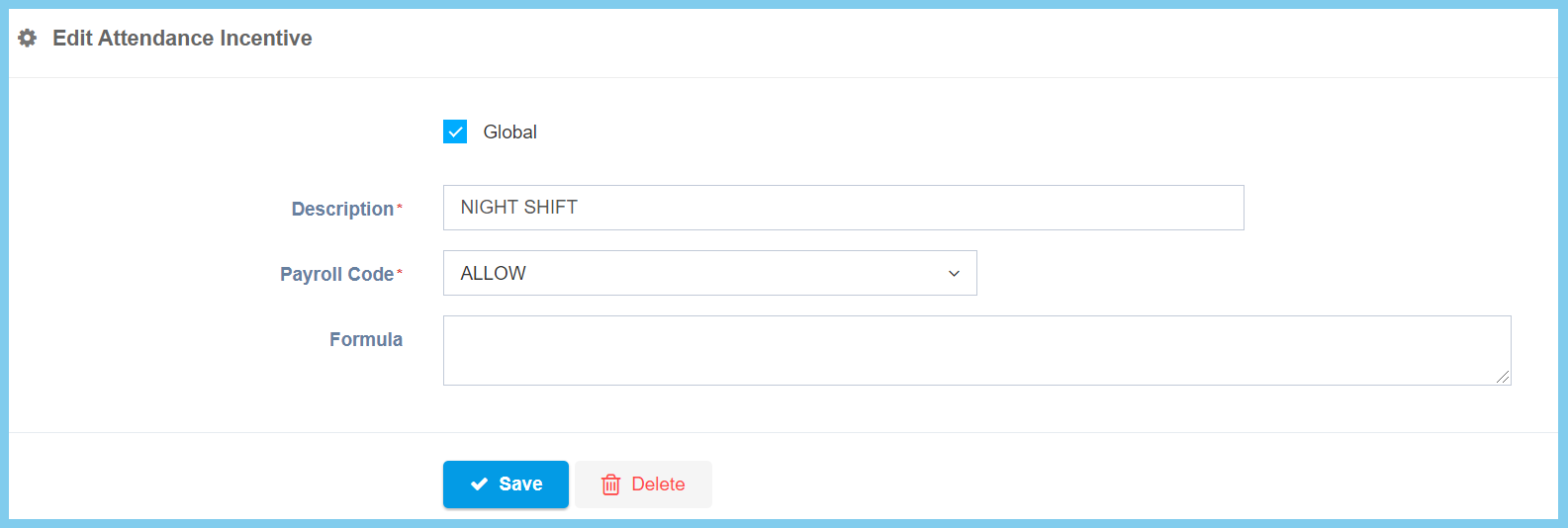 | Formula | Any alphanumeric | This is the formula for processing the payroll calculation when this formula is being chosen.