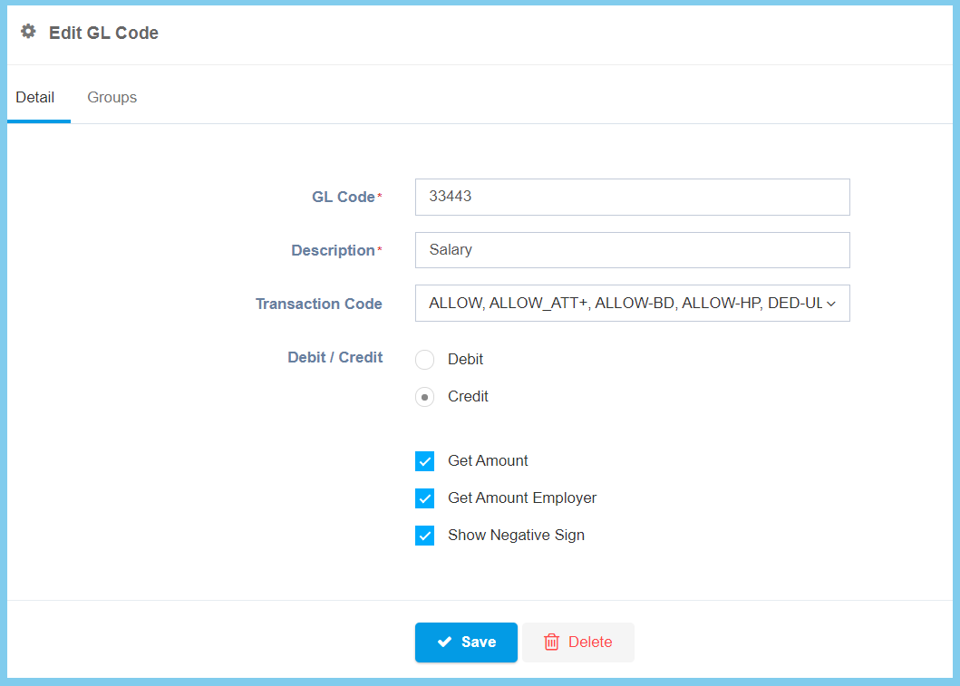 | Transaction Code | Setup from code settings | Choose a transaction code for GL setting purposes.