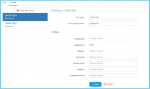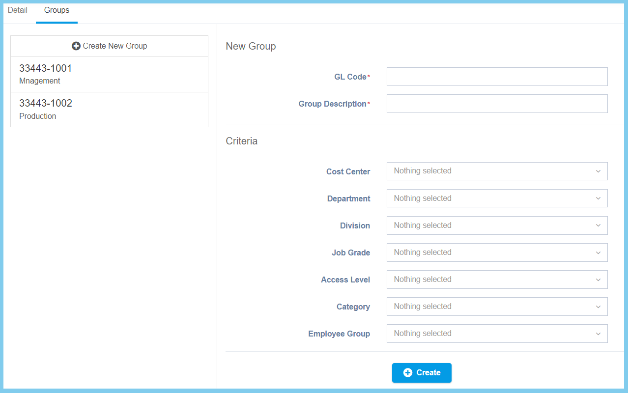 | GL Code | Any alphanumeric | Set a simple and unique GL code for group. |
