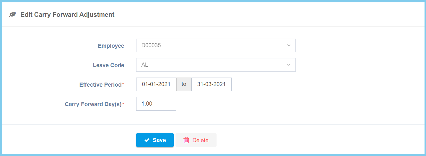 Carry Forward Day(s) Any number Enter the total carry forward leave days which allowed to carry forward in effective period.