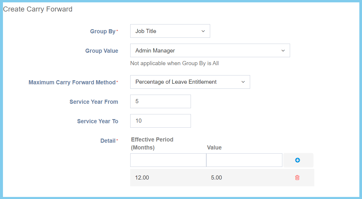 | Service Year From | Any number | Set the value of service year from which the leave entitlement is eligibility for employee. |