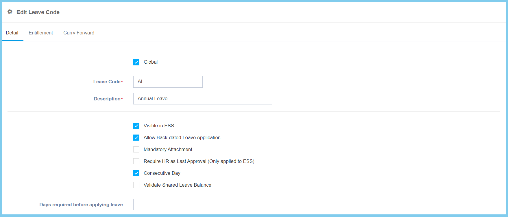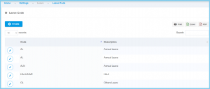| Leave Code | Any alphanumeric | To set simple and unique code to define leave code. |