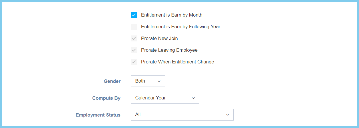 To set the leave entitlement to be compute by either in calendar year, financial year or anniversary year.