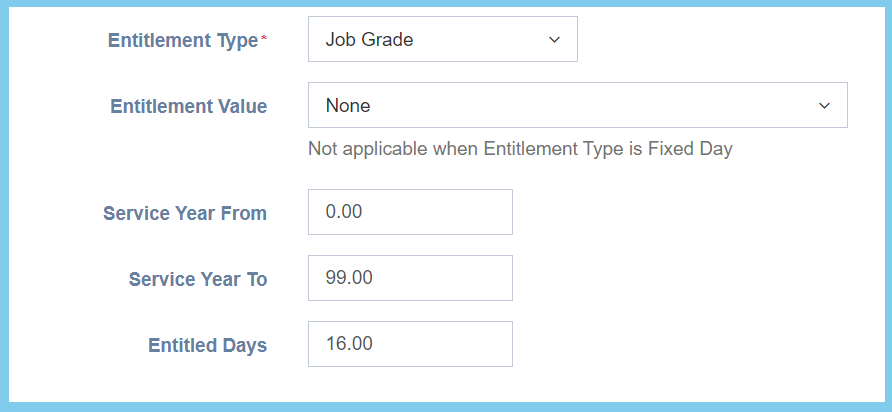 Set the entitlement type whether in fixed day, category, job grade or job title. |