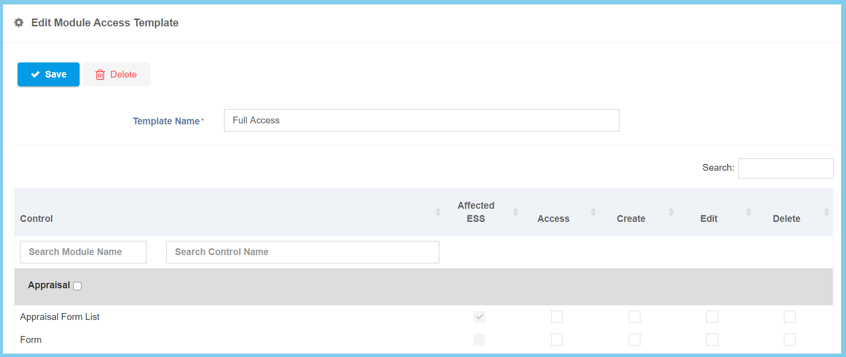 - In template, you can use search bar to search the module or control that you wish to tick for this template.