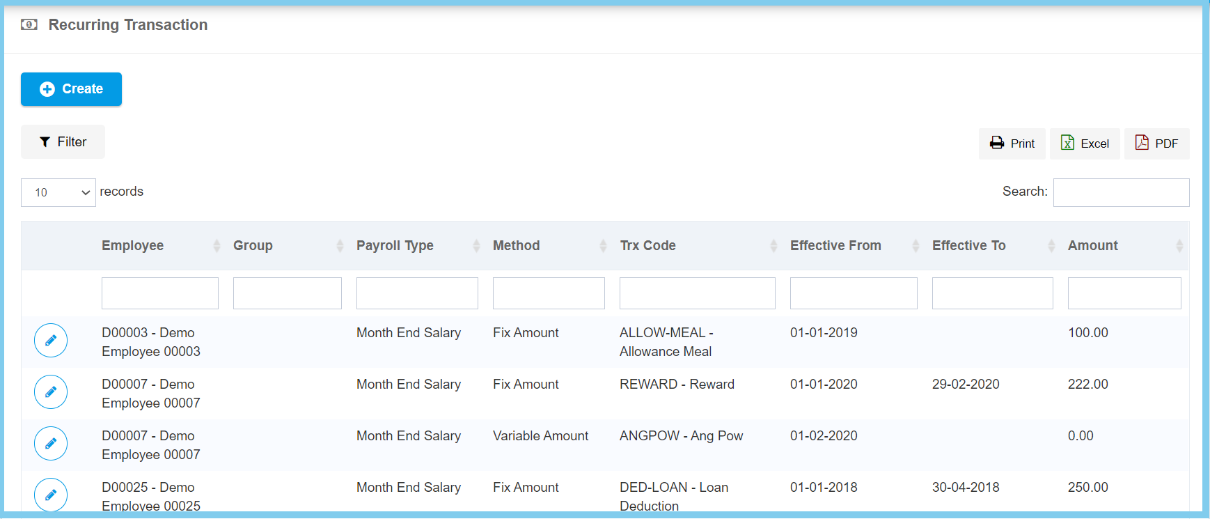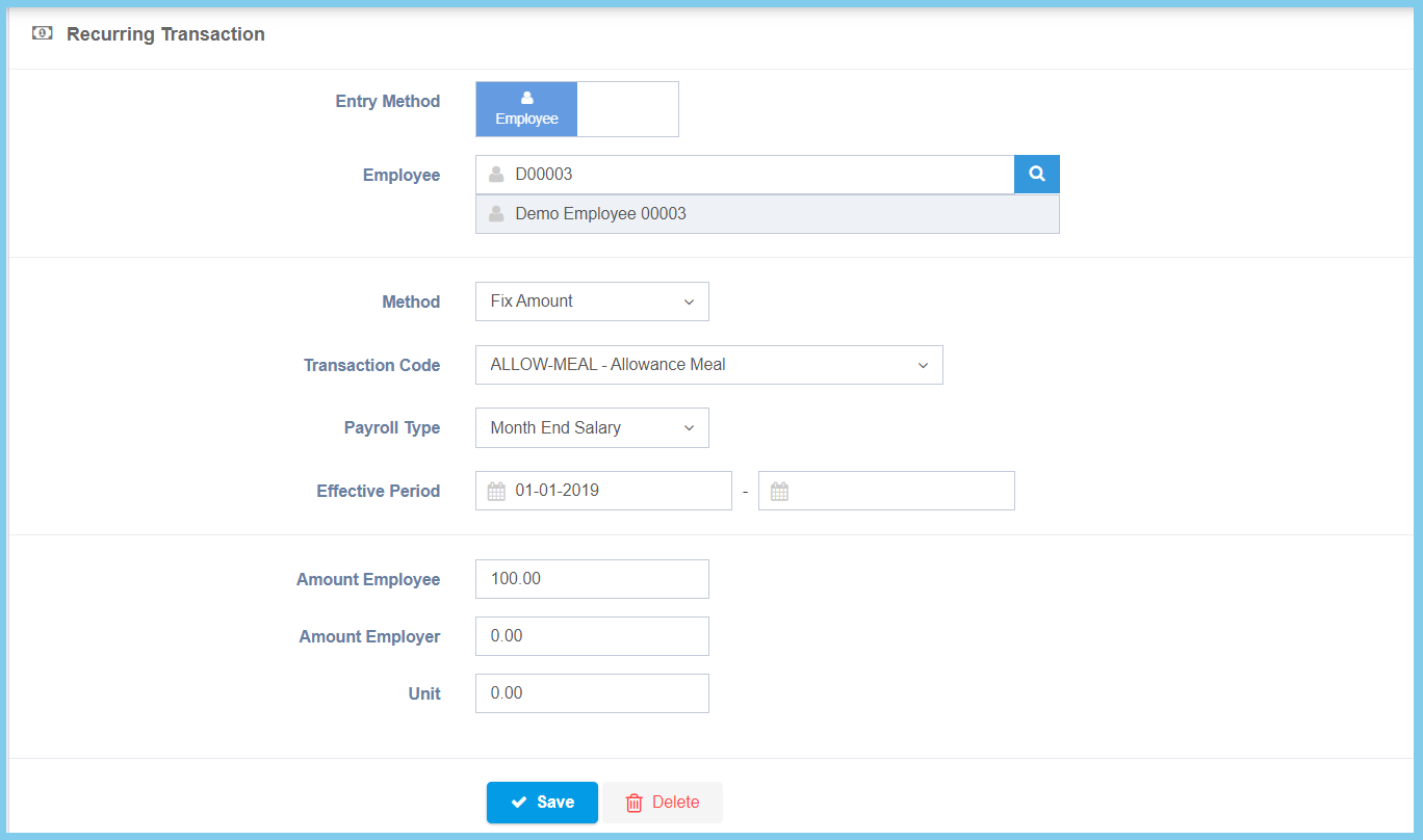 Amount Employee Any number Enter the amount of recurring transaction for employee.