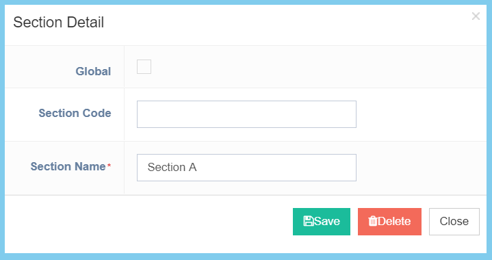 | Section Code | Any alphanumeric | To set simple and unique code to define section code. |