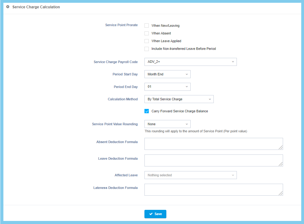 | Affected Leave | Setup from leave code | Select one of the leave code that will affected to service charge calculation.