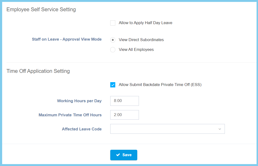 | Maximum Private Time Off Hours | Any number | Set the time value for the maximum private time off hours that can take. |