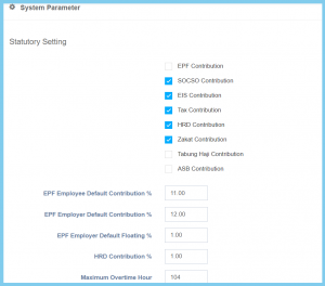 | EPF Employer Default Contribution % | Any number | This is the setup for the percentage upon the contribution ratio of an employer’s EPF. |