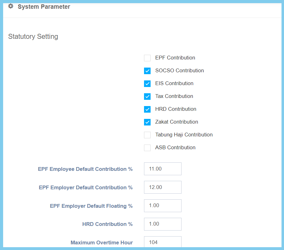| EPF Employee Default Contribution % | Any number | This is the setup for the percentage upon the contribution ratio of an employee’s EPF. |