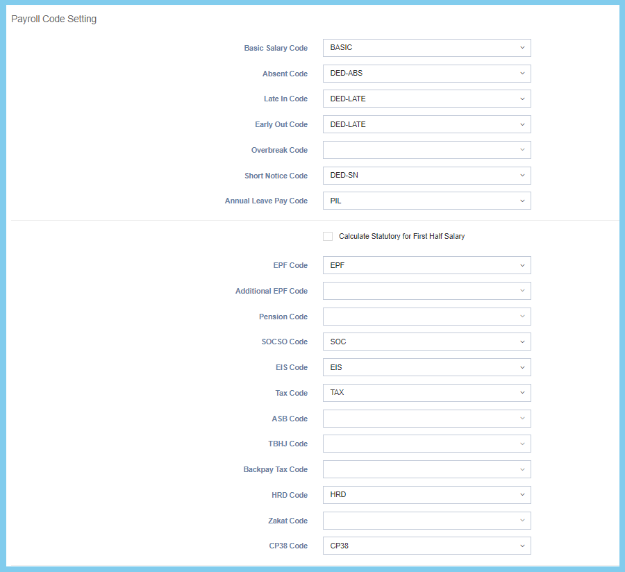 | EPF Code | Choose from Transaction Code | This setting is to configure the default code for EPF. |