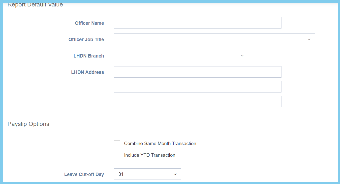 | Officer Name | Any alphanumeric | Set the name for LHDN officer. |