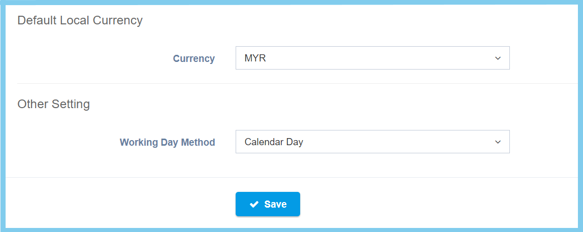 | Currency | Setup from currency code | This setting is to set up the default currency used within the company.