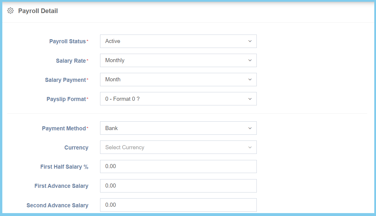 | Currency | Setup from currency code | Select the currency of the salary from option available.